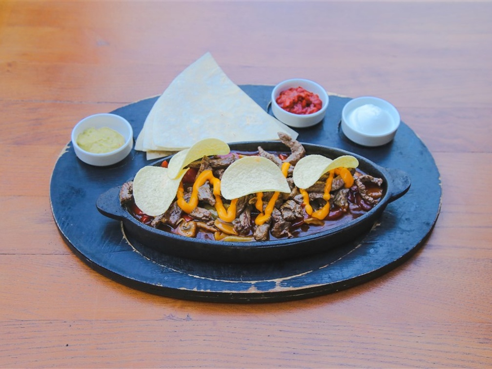 Mexican sos ve biberlerle sotelenmiş bonfile şeritleri, chedar sos eşliğinde